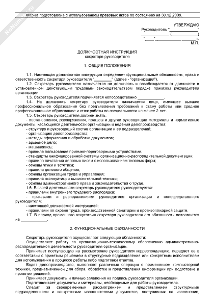 Обычно в должностных инструкциях перечисляются общие требования к сотруднику, описывается круг его должностных обязанностей, его права, ответственность, даются критерии оценки. Таким образом, должностная инструкция, с юридической точки зрения, становится частью трудового контракта между сотрудником и организацией. А с управленческой точки зрения, должностная инструкция – это результат совмещения оргструктуры компании и бизнес-процессов. Как правило, потребность в должностных инструкциях возникает на этапе формализации бизнес-процессов. И тогда должностная инструкция становится руководством к действию для сотрудников данной организации, то есть отражает информацию о том, как они участвуют в достижении целей компании, решения каких задач от них ожидают, на основании каких критериев будут оцениваться результаты их работы. Должностная инструкция используется также при аттестации специалистов. Скачать образец Должностной инструкции начальника отдела продаж (Word) Посмотреть полный каталог бланков Правила составления должностных инструкций для начальника отдела продаж Что касается начальника отдела продаж, у него может быть огромное количество обязанностей, так как большинство бизнесов строится в основном на продажах. Начальник отдела продаж планирует продажи, работает с менеджерами, участвует в переговорах и делает еще массу дел, по большому счету он обеспечивает продажи, поэтому его деятельность должна быть связана в основном с отделом планирования и отделом послепродажного обслуживания, хотя в своей работе он также должен ориентироваться на деятельности многих других отделов. Глобально должностные обязанности начальника отдела продаж можно подразделить на 4 большие категории: оперативные, стратегические, кадровые и процессные. Он должен заниматься организацией сбыта продукции, разрабатывать и предоставлять планы продаж, составлять итоговые отчеты, правильно вести рабочую и отчетную документацию, разрабатывать стратегии и координировать работу своего отдела, мотивировать сотрудников и обеспечить безопасность их условий труда, проводить переговоры с клиентами, содействовать развитию с ними долгосрочных партнерских отношений, заключать договоры на реализацию продукции, осуществлять отбор менеджеров в свой отдел и многое другое. Начальник отдела продаж имеет право визировать документы в рамках своей компетенции, вносить предложения по премированию сотрудников при перевыполнении плана продаж, предлагать методы по усовершенствованию работ своего отдела и прочее. В должностной инструкции начальника отдела продаж отражены не только его права и обязанности, но и ответственность, которую он несет в соответствии с действующим трудовым законодательством РФ.